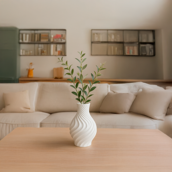 Este florero de líneas onduladas genera movimiento visual y aporta presencia sin necesidad de recargar el espacio.