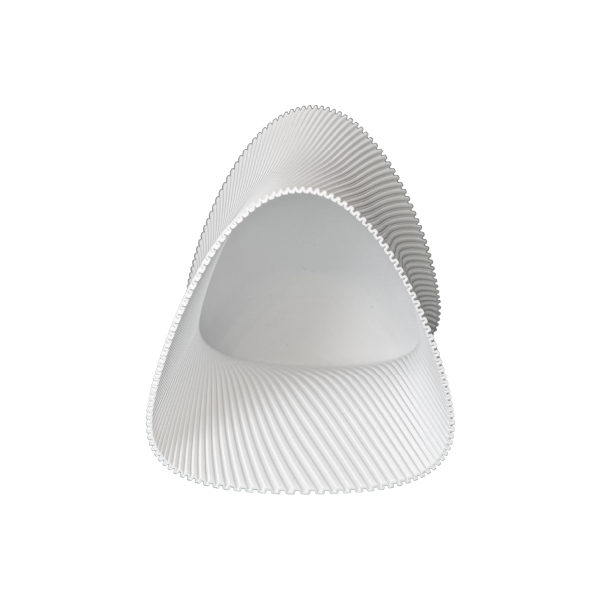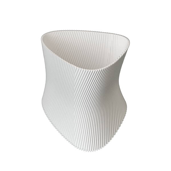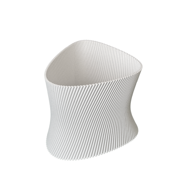 Una pieza que combina geometría y fluidez en una silueta irregular, generando un objeto visualmente interesante y versátil.