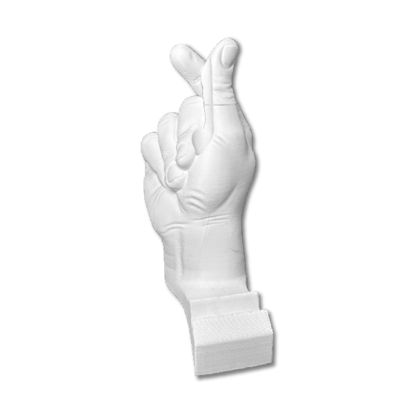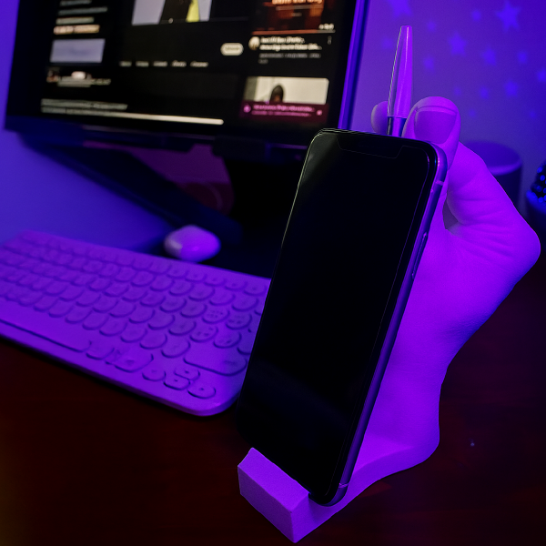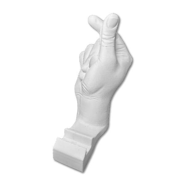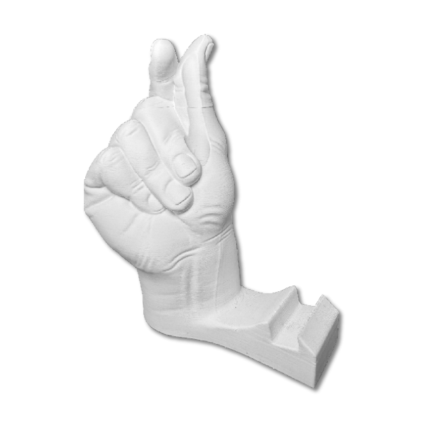 Una pieza inspirada en gestos simbólicos de la mano, reinterpretada como soporte para celular.