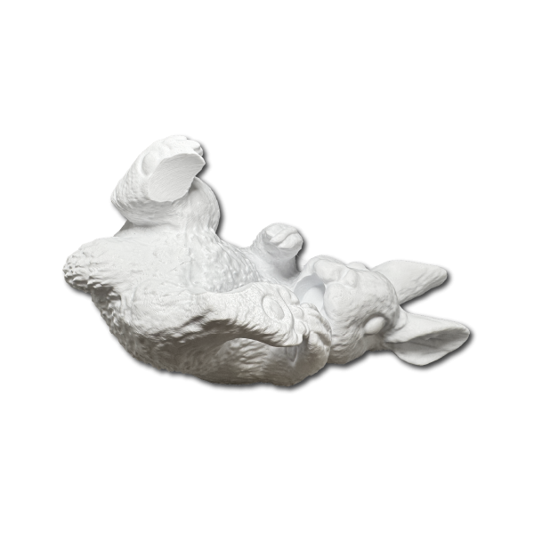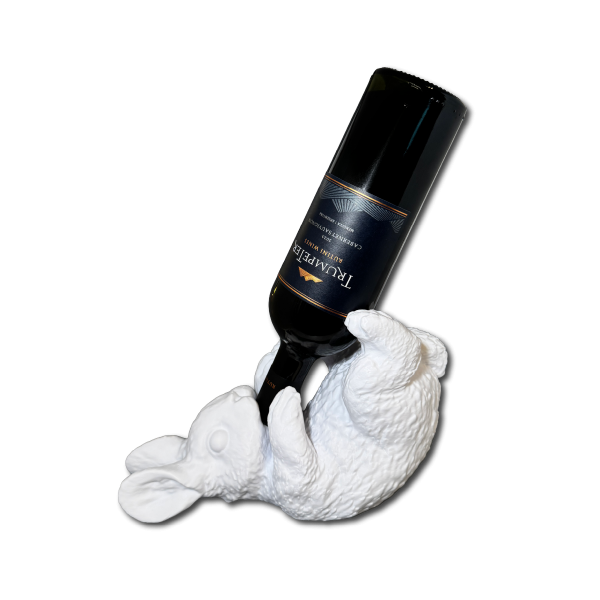 Este conejo sostiene la botella y transforma un gesto cotidiano en un objeto con presencia.